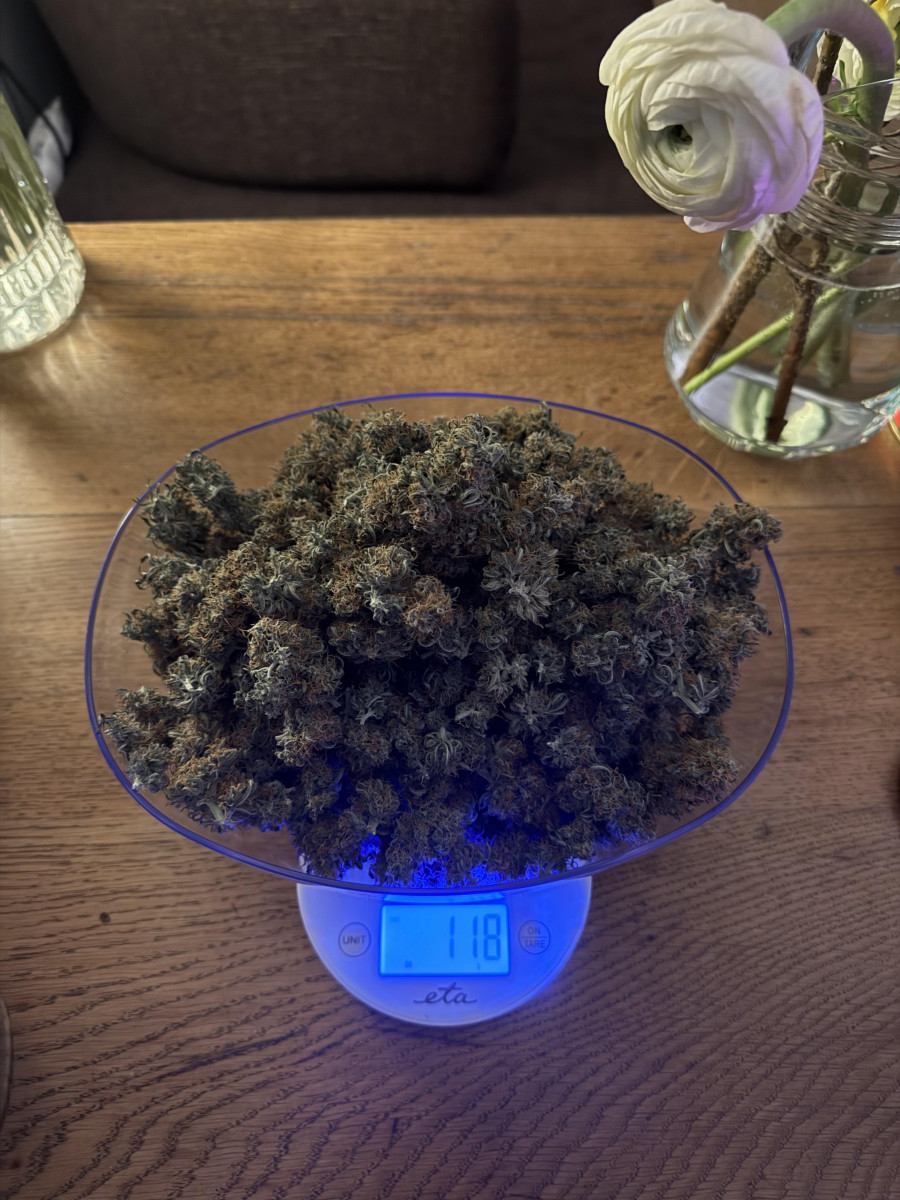 Может быть мне попался отличный фенотип, но он показал взрывной рост на веге и буйное цветение. Шишки пахнут цитрусовыми конфетами, и я просто не могу дождаться, чтобы попробовать после хорошей пролечки. В итоге получил 170 граммов сухих и очищенных от стеблей шишек.
