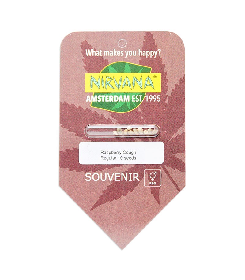 Сатива-доминантный сорт конопли Raspberry Cough regular представляет собой гибрид первого поколения с густыми красными волосками, который способен менять свою окраску на голубую при культивации в условиях пониженной температуры. Он был выведен селекционерами сид-банка Nirvana из материнского растения с камбоджийскими корнями, отличающегося высоким уровнем содержания ТГК, и титулованного флагманского сорта компании – Ice. Гибрид активно используется в качестве лечебной марихуаны благодаря высокому содержанию КБД. Производитель рекомендует выращивать его исключительно в закрытом грунте.