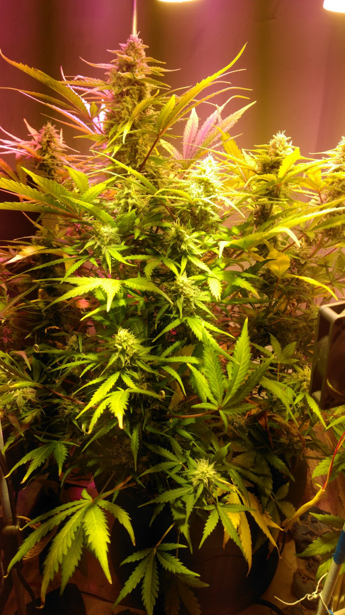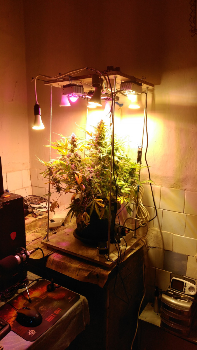Земля -70% с огорода, 30% с пакета (какую то в сарае нашёл,цветочную,магазинную, состав не знал), ни перлита, ничего такого..рыхлящего...Пролил всё это водой с крана (потом как выяснилось ппм кранной воды 342 у меня) до дренажа, и на следующий день семку кинул в землю (не проращивал заранее) на глубину примерно 2см.,накрыл сверху пластик.стаканом с дырочками и под прожектор "фито" 50Вт красно-синего спектра 660nm-450nm. Высота от земли до прожектора примерно см 50. Растиха вылезла примерно на 2-3 день. И как рванула вверх..глист см 8 и сверху 2 листика (пришлось вкрутить шурупы в горшок по периметру и натянуть капроновую нить,чтоб растиха не упала. Подсказали,что дело в свете. Накупил бытовых LED ламп 6400к по 25Вт 8 штук, снял с них плафоны и подвесил над растихой в 12-15 см от неё. Рост в высоту остановился и начала набирать в ширину. Потом на цвете поменял лампы на 2700к, у меня ещё появились к цветению 2 матрицы по 50Вт 3500к и полного спектра. Нормально всё так пошло. Поливал водой с крана и удобрами Biobizz Grow и Bloom. Перед харвом пролил до дренажа водой с крана ppm был 420 на выходе. Почти то,что нужно. Выдержал её 71 день. На 71-ый срубил (за 3 дня до рубки отключил ей свет и накрыл тёмной тканью, чтоб свет снаружи не проникал). Сейчас висит 2-ые сутки в сарае, сушится в холоде. И вот теперь она запахла очень вкусно)) Что то такое, сладкое с мятой что ли..не могу разобрать..Обрезал ей нижние листья, нанюхался так, что аж голова закружилась и ноги ватные стали))))Подошёл к зеркалу, зрачки расширенные сильно были)) Запах у неё реально адски мощный) .