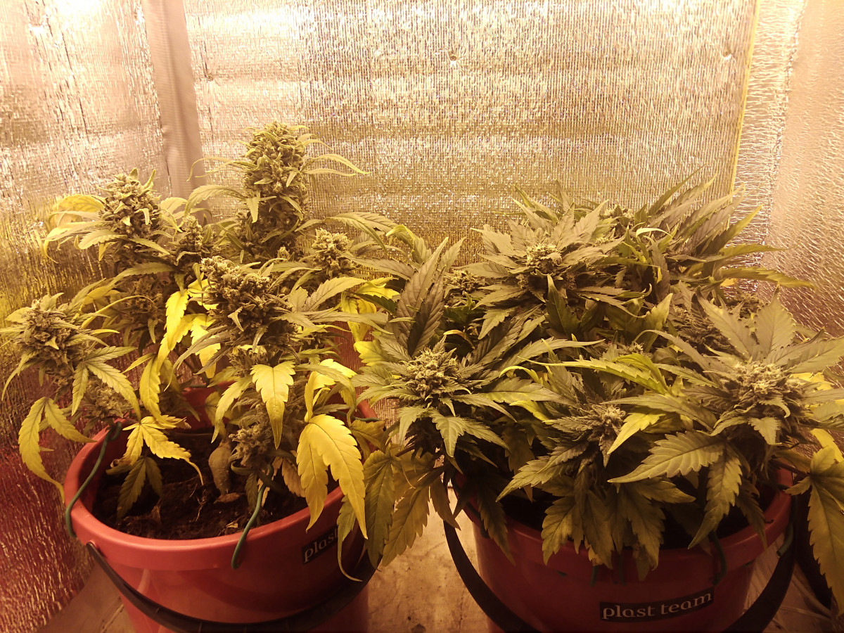 тот что слева весь цикл только и стрессовал, то пререломил при подгибке, то ветку сломал,вообщем ему хорошо досталось. и на вид лучше правого с которого ни разу даже листика не обрезал. но справа шишки прямо каменные. а слева помягче. по весу пока не знаю. пару дней в темной прохладе подержу и буду резать.
