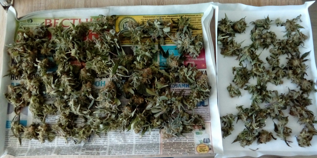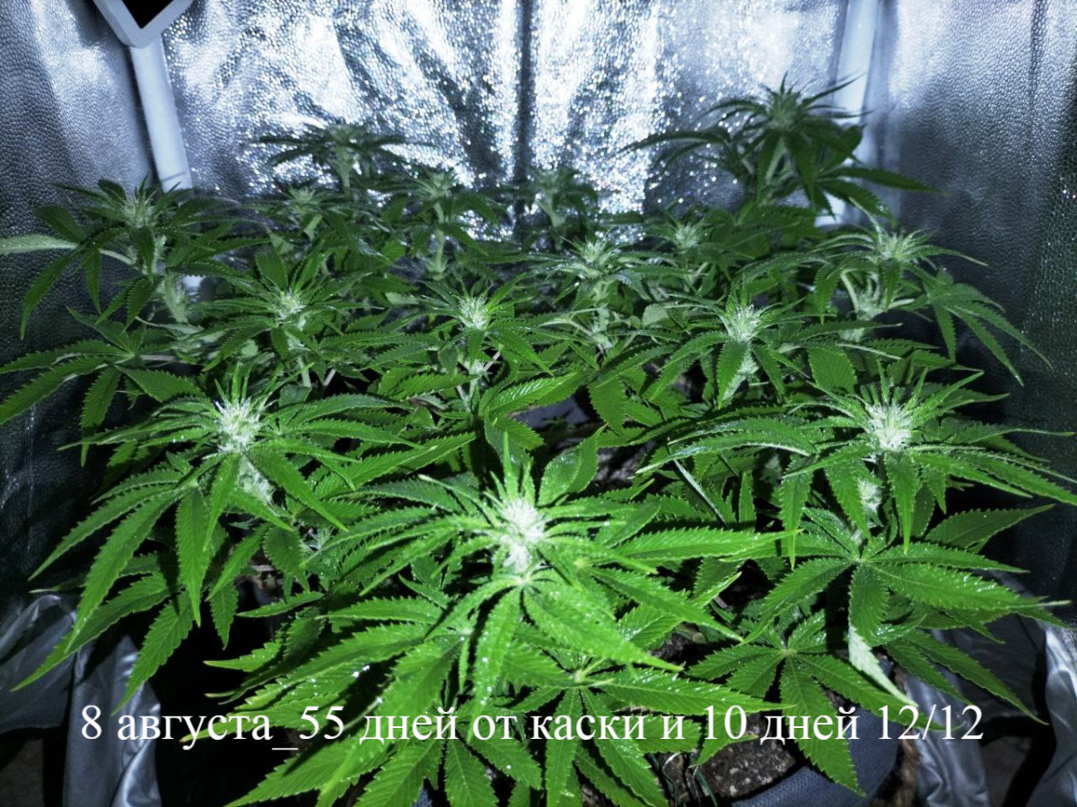 Из 3-х семок проросли все. Гроубокс 1,7 х 1,7 м., высота 2,5 м. примерно; свет ЛЕД 2 по 100, ЭСЛ 4 по 85, ДНатка 250 (в конце дня на несколько часов давали), квадраты ФИТО 2 шт. + точечная подсветка по мелочи; контроль температуры и влажности, вентиляция, газообмен. Из удобрях только Гуматы и Агрикола немного, ну и полив чистейшей водой Святого Озера Байкал. Кусты красивые и сильные, похожи друг на друга, как и должно быть. Отцвела быстро, предполагали дольше. Сняли примерно 4 литра уплотнённых, отманикюренных сырых шишек с куста, сахара много, липкая, под конец харва ножнички аж не стригли. Вытаскивать и разлеплять дома шишки из банок замучался. На фото половина одного куста (второй вот-вот дойдёт). Не досохла ещё, но, реально, даже после микроволновки сиплые шишки вставляют так, что "ноги отрывает") Представляю, какой лютый стаф будет после того, как она высохнет и пролечится. Уже скоро)