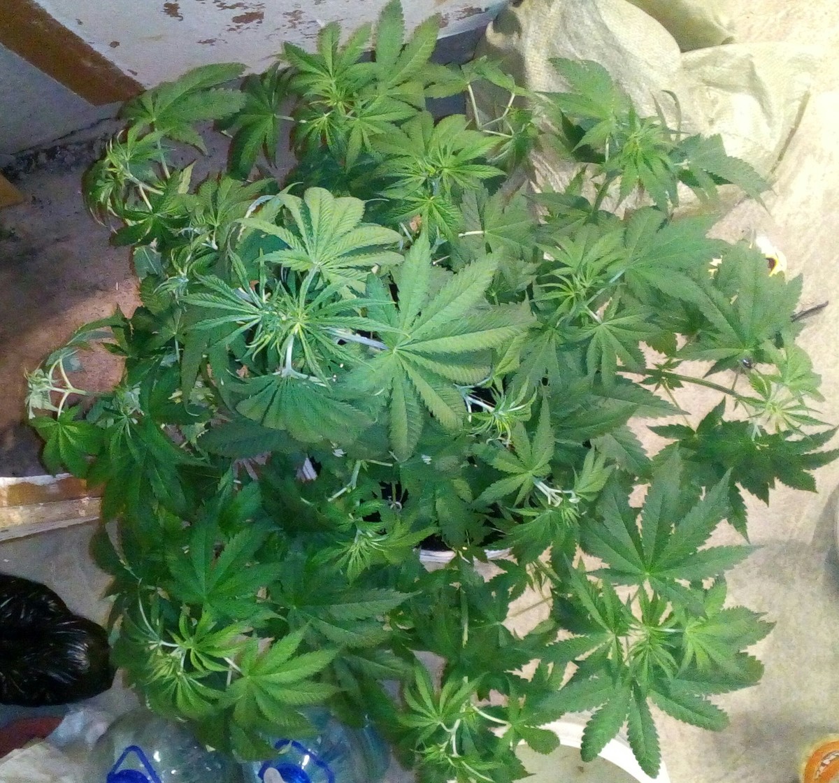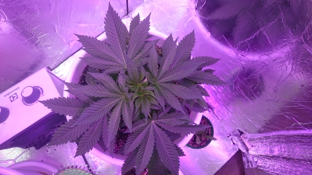 Ростишки 33 дня от каски , а она всего 20 см, карлик какойто. ягнул макушку боковые вылезли по 8 веточек. В ровень с оснавной макушкой, Что это х,з. 15 литров земли, лед 200 ват. все условия супер, что за х...я не знаю. все два куста , Один в один.. Позже отпишу,,,как дальше... фото потом